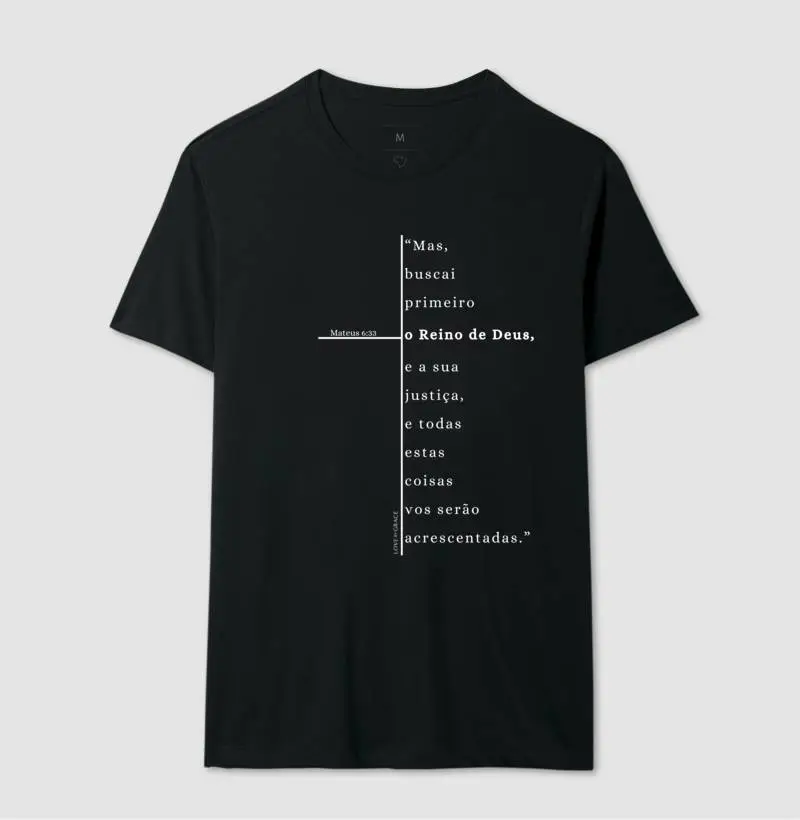 Uma camiseta de algodão, simples e confortável, carregando a poderosa mensagem de Mateus 6:33 estampada com destaque. A frase "Buscai primeiro o Reino de Deus e a sua justiça, e todas estas coisas vos serão acrescentadas" ressalta a importância da busca espiritual como caminho para a prosperidade. Use essa camiseta como um lembrete diário para priorizar valores transcendentais, confiante na promessa divina de abundância.