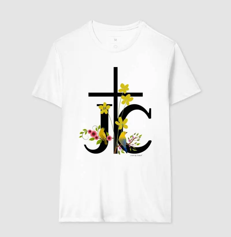 Esta camiseta é confeccionada em 100% algodão, garantindo conforto e durabilidade. A estampa central apresenta dois pássaros pousados nos galos, simbolizando a vida e a liberdade. Entre eles, destaca-se uma cruz, representando a fé e o renascimento. As iniciais "JC" de Jesus Cristo estão elegantemente posicionadas ao lado da cruz. Uma peça ideal para expressar espiritualidade e devoção com estilo.